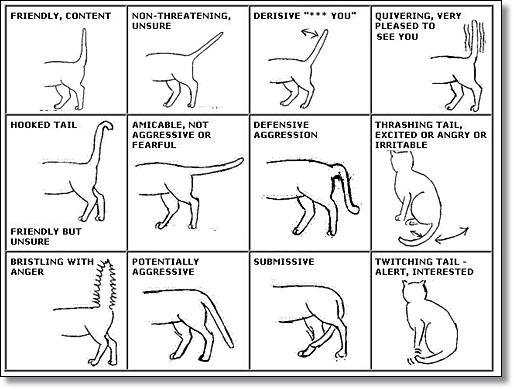 Here is a chart that shows some obvious conflicts with dogs: https://www.dogtraining.world/wp-content/uploads/2016/09/cat-language.png