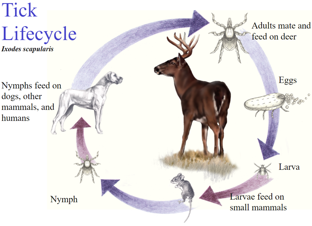 This species' life cycle includes three hosts—mating also occurs on the host. After fertilization, the female feeds for 14 days before laying around 4,000 eggs in protected areas. Due to the females' proclivity to move upward, egg masses are likely found in aboveground cracks and fissures. Eggs hatch in 17–30 days. The larva feed for around six days, then drop to the ground and molt to the nymphal stage lasting 5–23 days. The nymph feeds for 4–9 days, then leaves the host and molts to adulthood. This means that countless generations can survive each year under favorable conditions. In harsh conditions, unfed larvae can live nine months, unfed nymphs six months, and unfed adults 19 months.