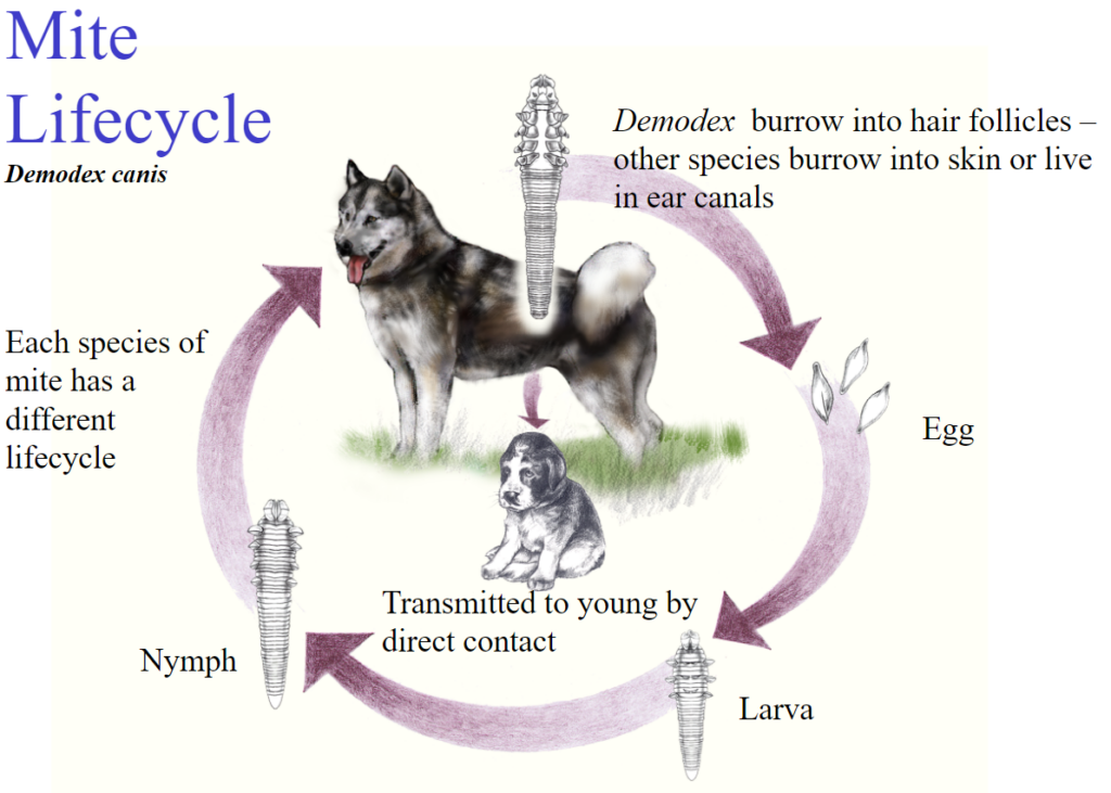 Demodex canis is a long, cigar-shaped mite that burrows in hair follicles and sebaceous glands. Due to the location of this mite, the spread is often difficult. Thus, it is assumed that transmission happens during the suckling stage. Immunocompromised animals are prone to be infected. An early symptom is alopecia around the eyes and on the forelegs.
