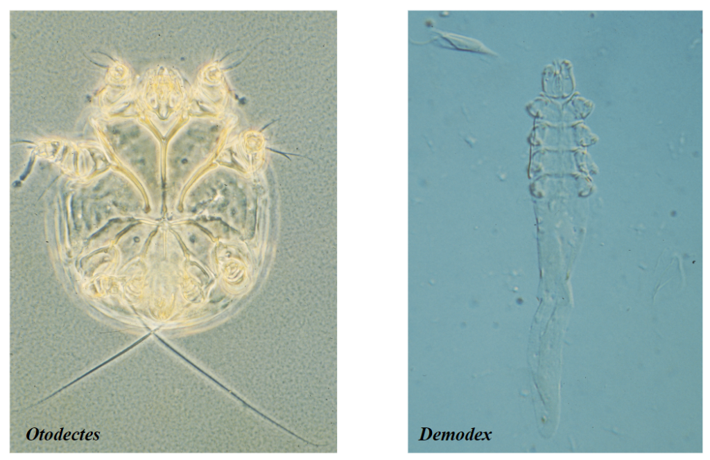 Otodectes, also known as ear mites, infect cats, dogs, and other small animals. The mites are found in the external ear canal, tail, and feet. They feed on the waxy coating of the ear canal, often causing damage. Otodectes is a three-week parasite that lives on the host.